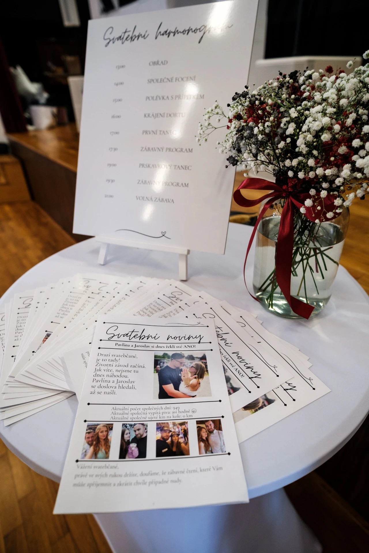 Kompletní návrh a realizace tiskovin, výzdoby a fotokoutku, detailní plánování svatebního dne, tvorba harmonogramu a pečlivá koordinace – vše tak, aby byl tento den pro snoubence bez stresu, v pohodě a přesně podle jejich představ.