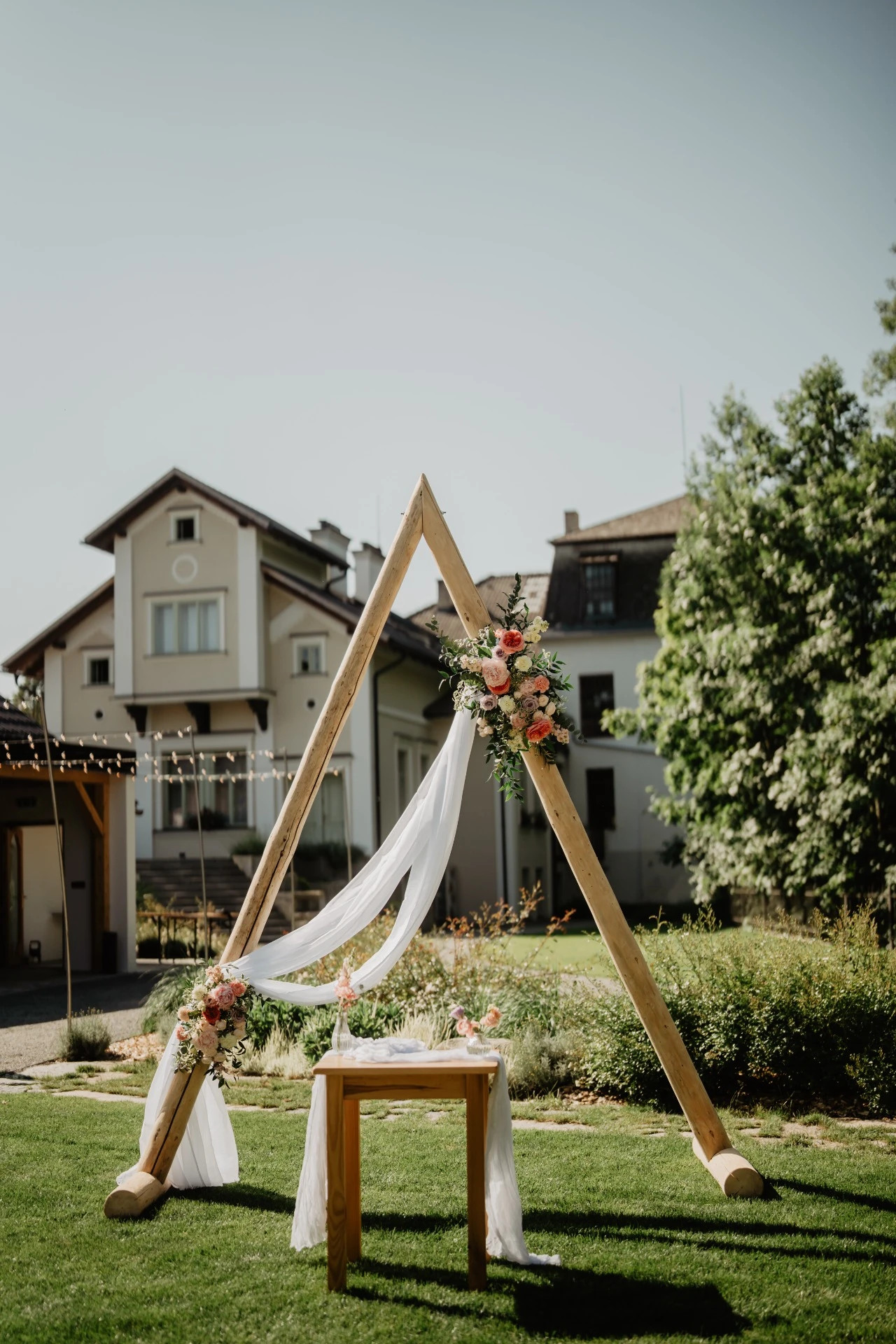 Srdcem celého obřadu v rozkvetlé zahradě se stala slavobrána v netradičním tvaru trojúhelníku. Tento moderní geometrický prvek vnesl do klasického svatebního dne neotřelý a dynamický rozměr, který okamžitě upoutal pozornost každého hosta.