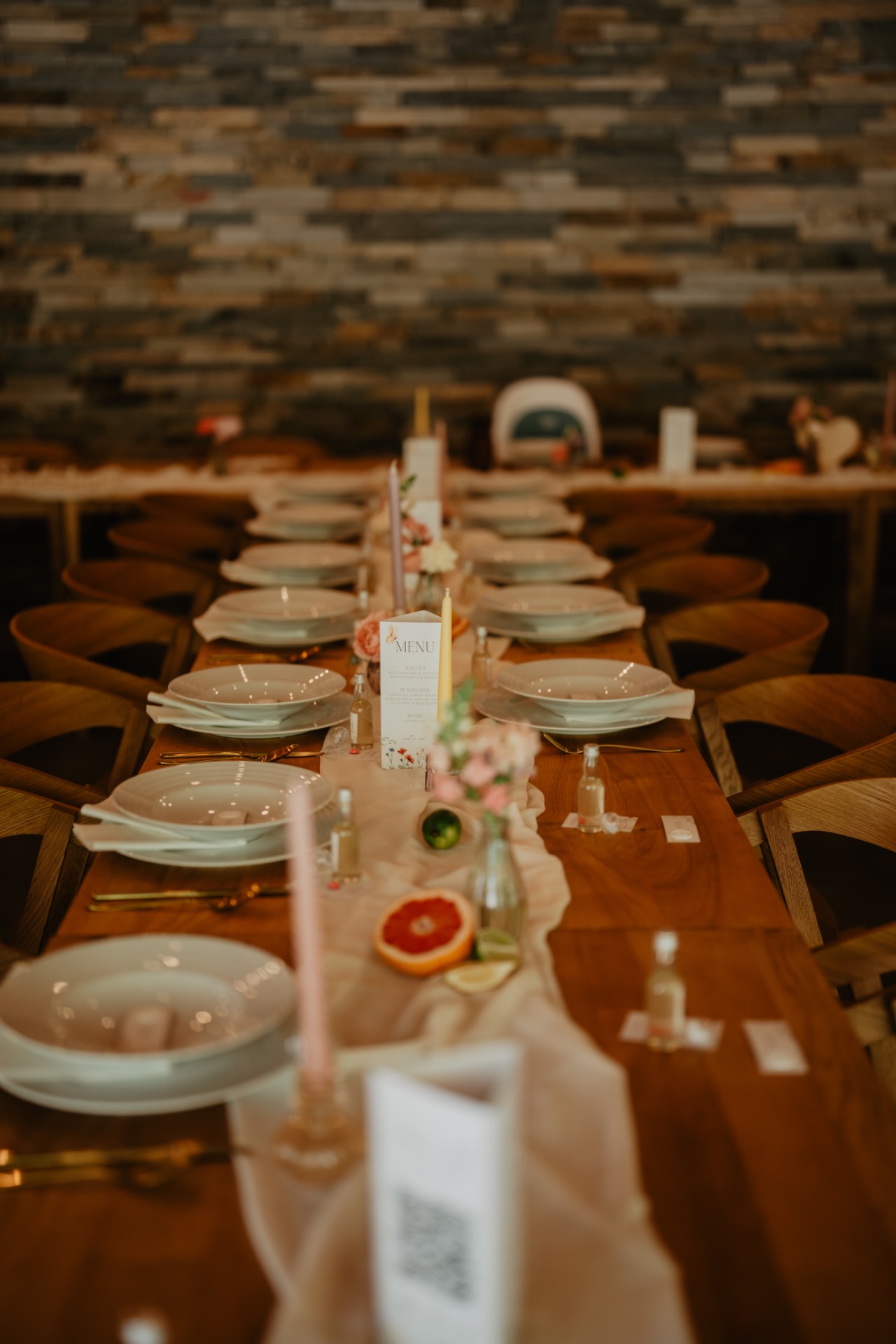 Abychom do jemné pastelové palety vnesli ještě více života, vsadili jsme na detaily v podobě čerstvých citrusů. Citrony, limetky a nakrájené pomeranče na svatebních tabulích zafungovaly jako dokonalý vizuální i smyslový prvek.