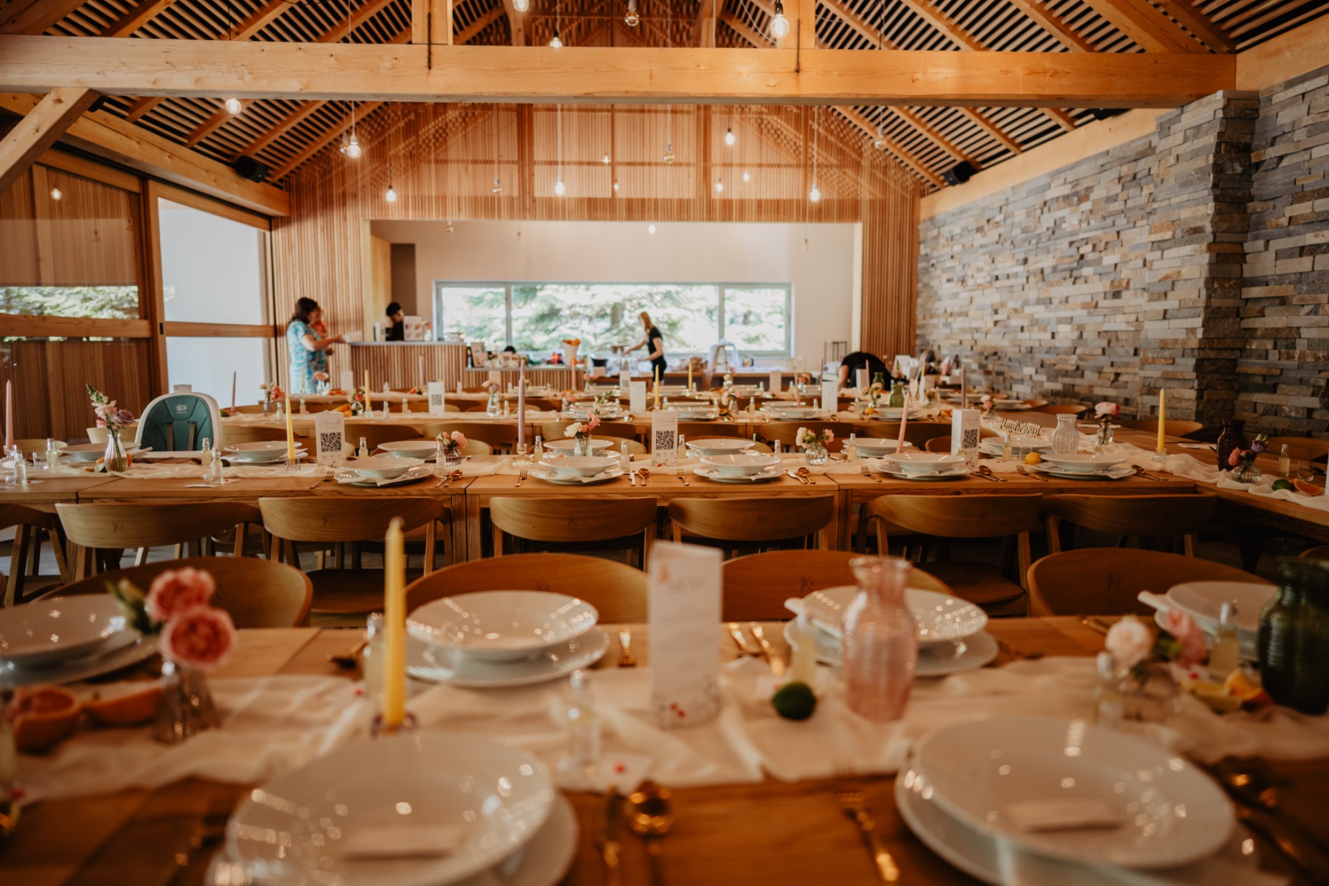 Zatímco Pánská vila dodala dni punc historie, prostory moderní stodoly otevřely dveře nespoutané kreativitě. Vysoké stropy, dřevěné trámy a industriální prvky se staly plátnem pro neuvěřitelnou hru barev a světel.